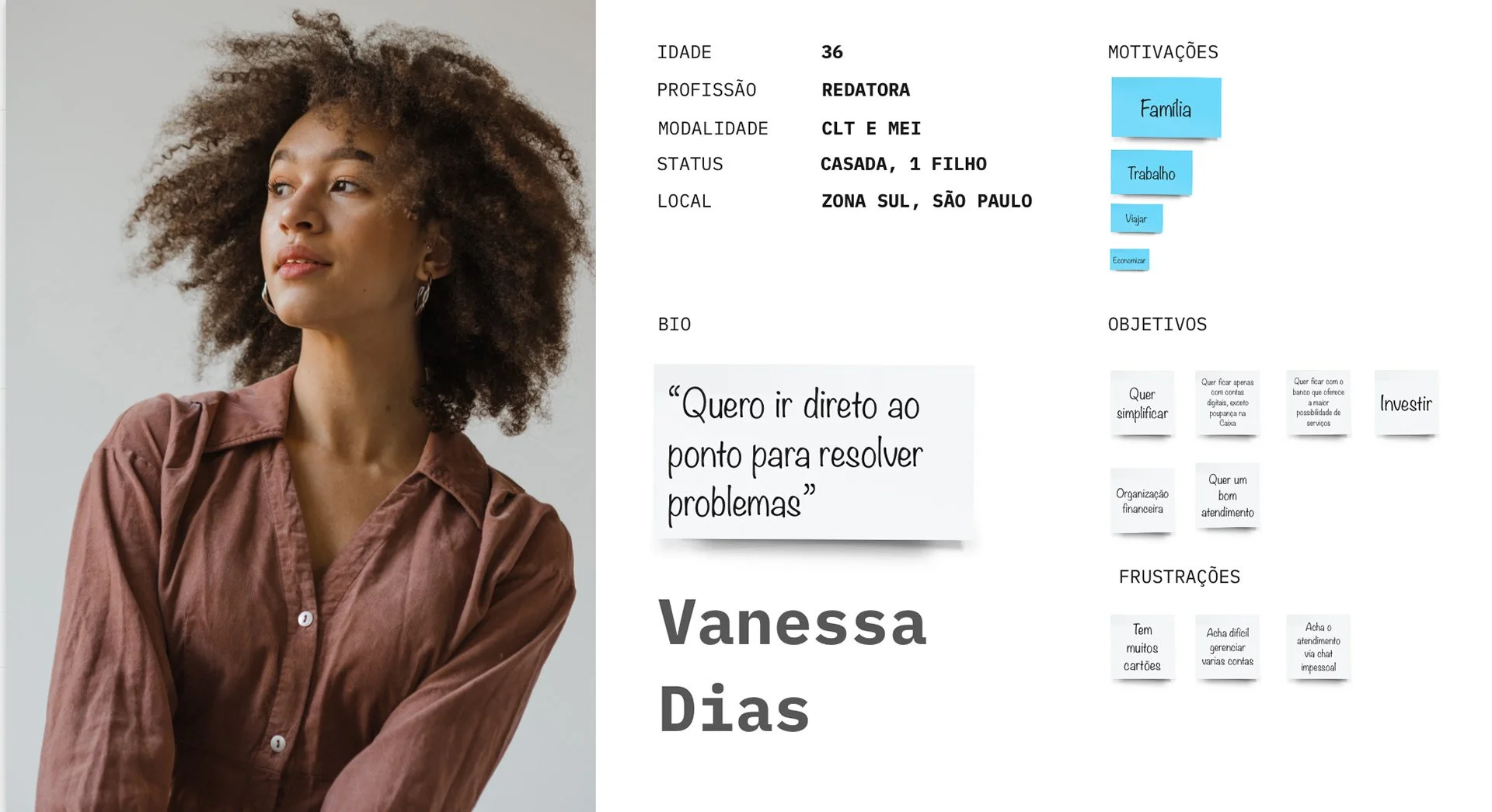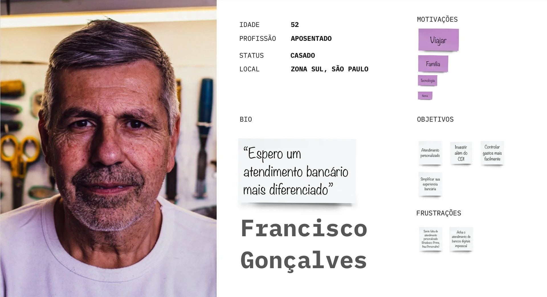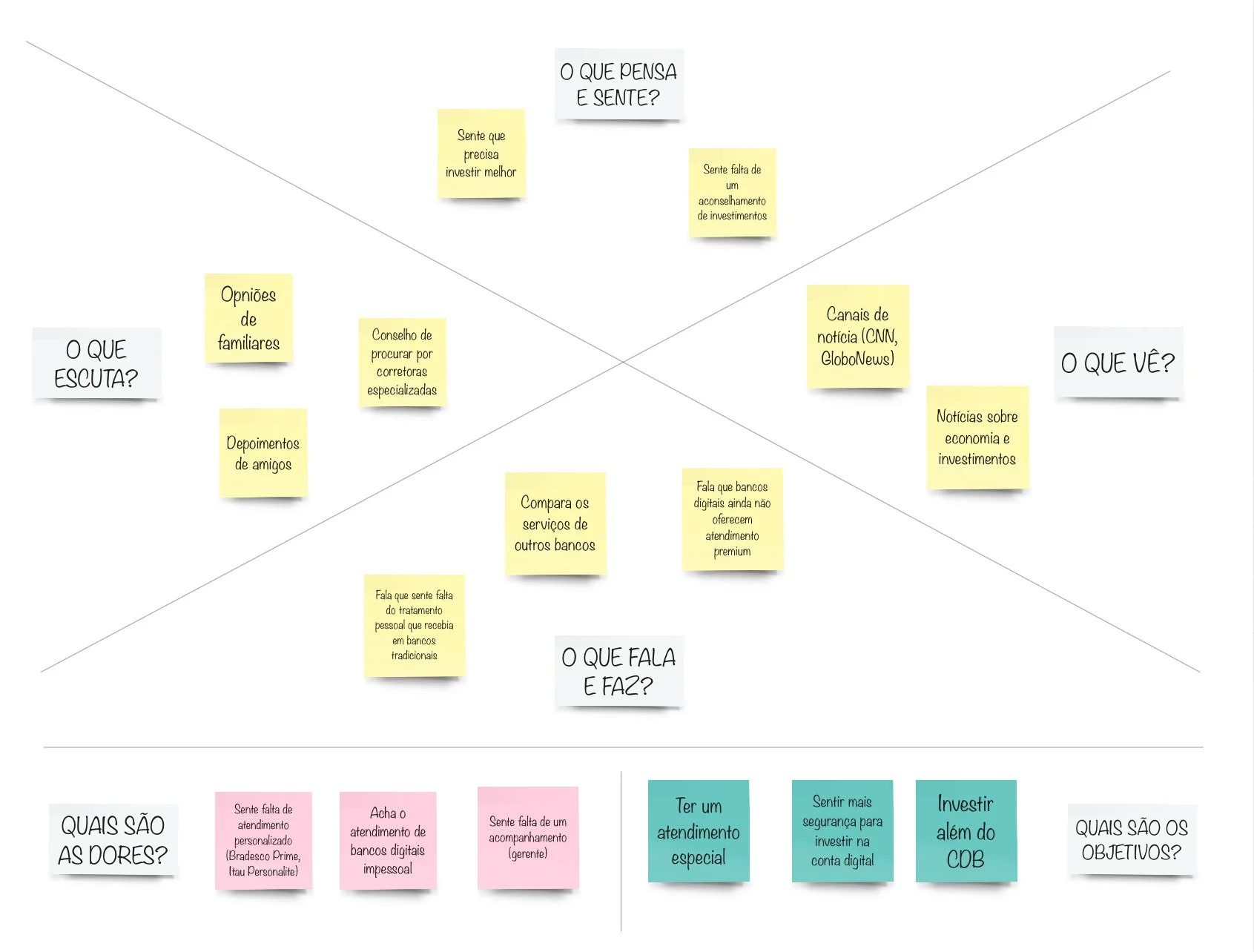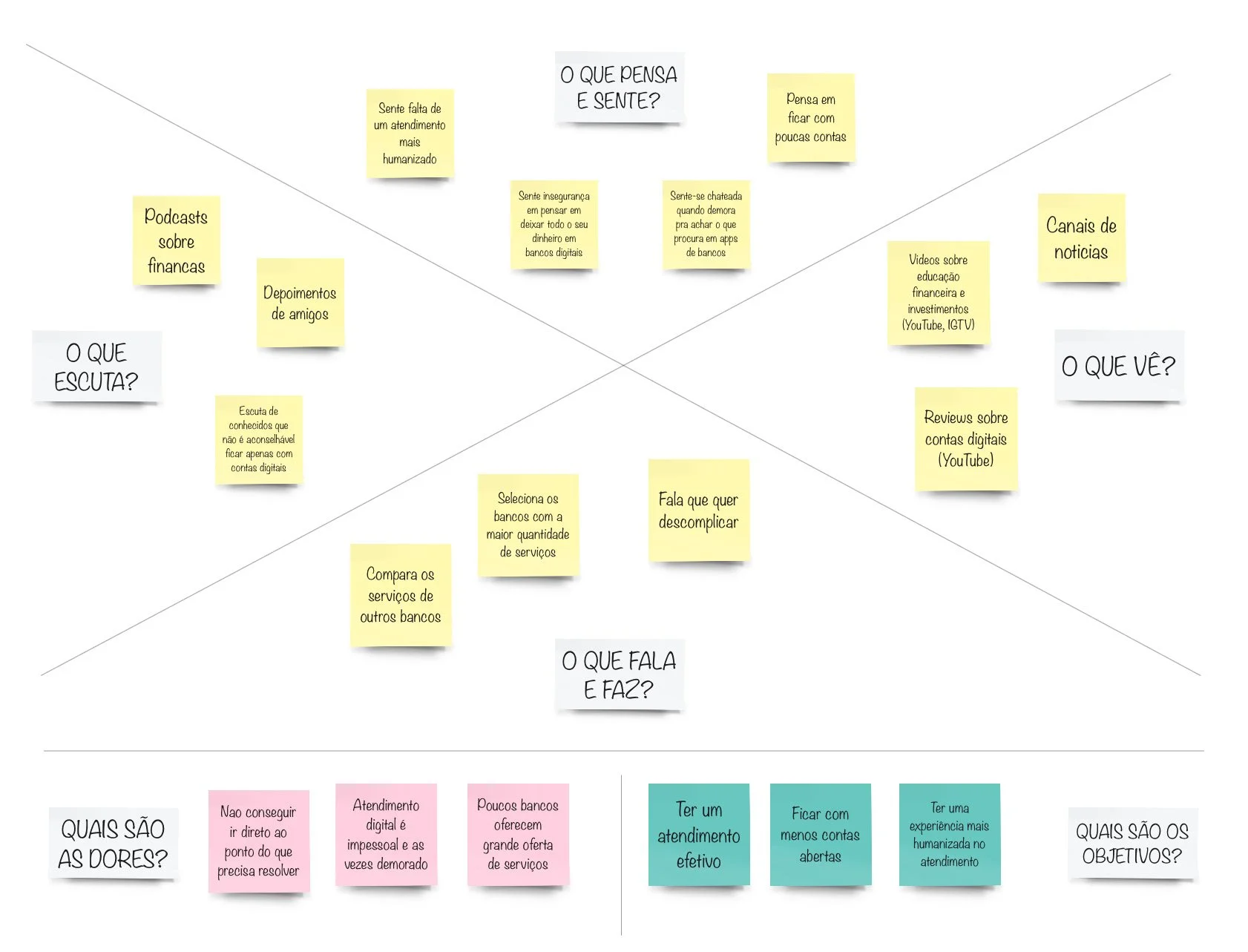 Com base em todo o material levantado surgem as personas para amparar o desenvolvimento das hipóteses através dos mapas de empatia, histórias e jornadas do usuário e declaração de necessidades.