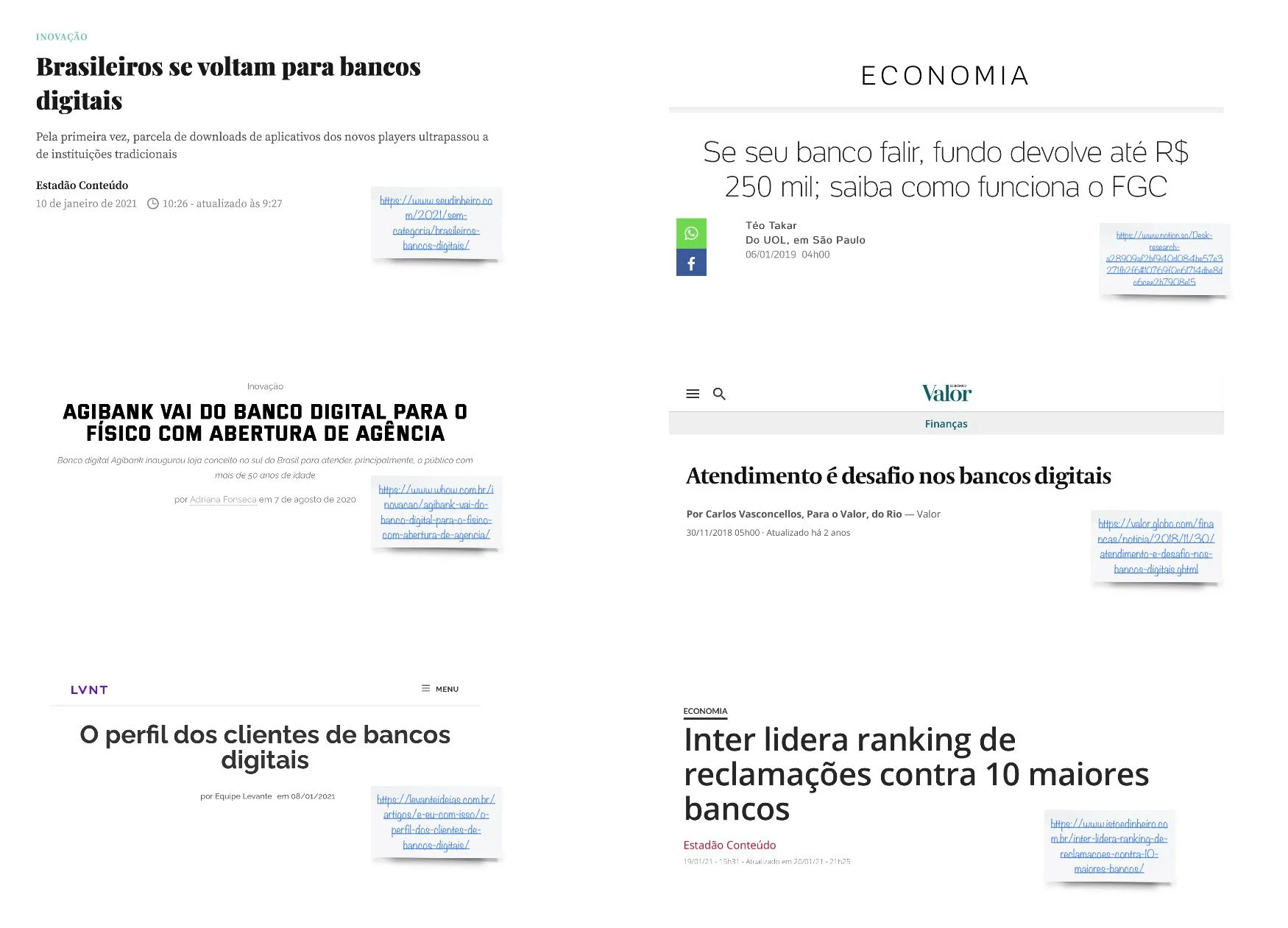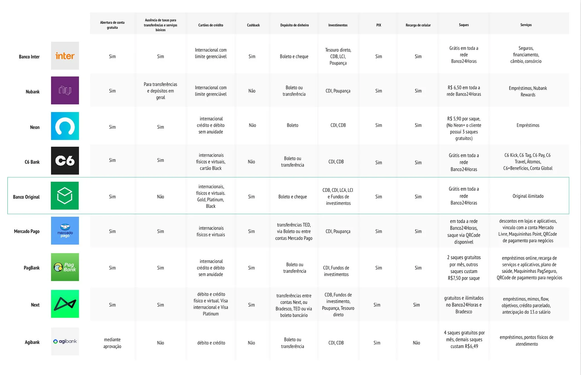 Através de um benchmarking foi possível comparar a oferta de serviços comuns e diferenciais prestados por grande parte dos maiores bancos digitais brasileiros.
