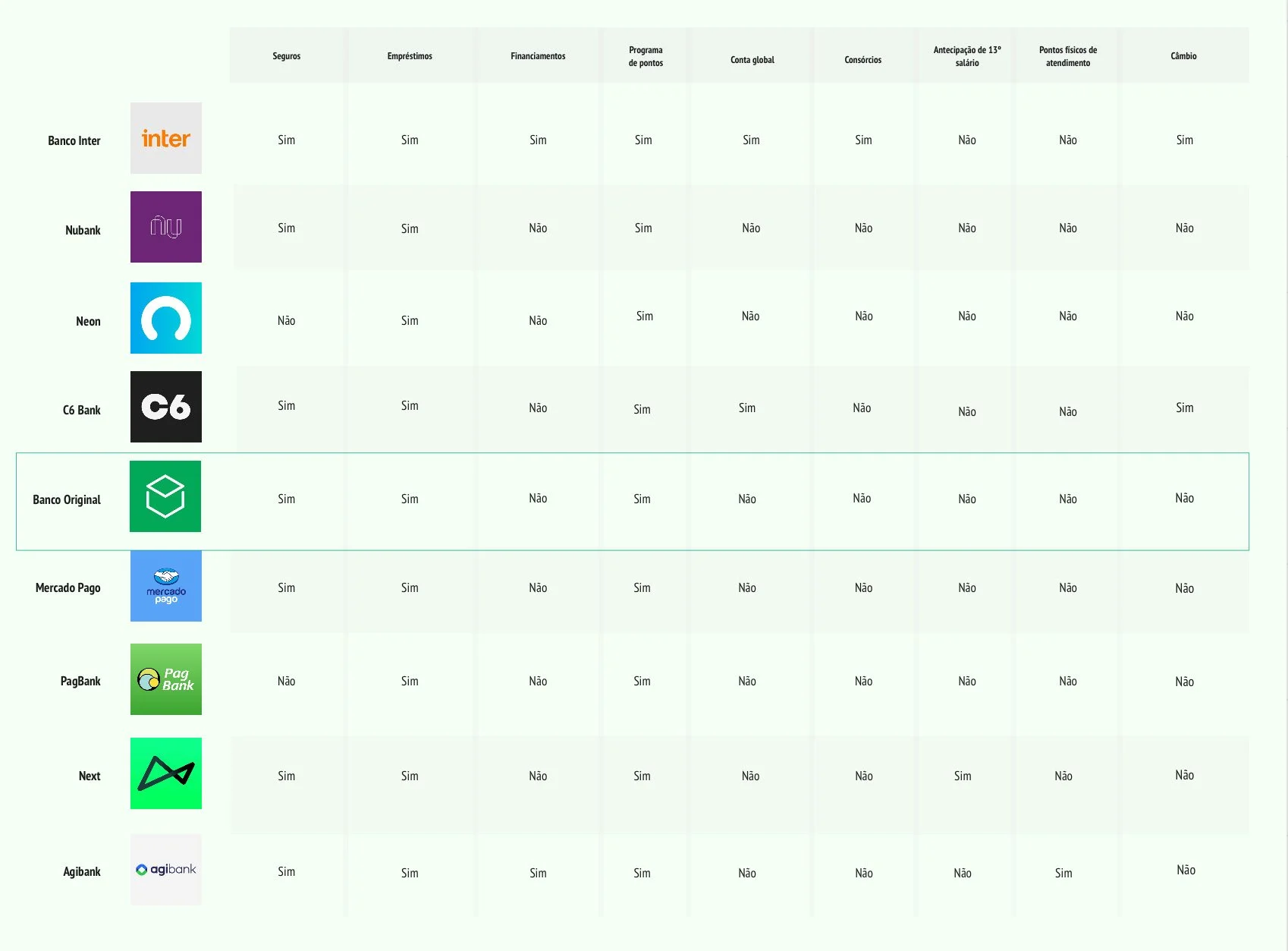 Além da maior oferta de serviços , outros bancos também oferecem maior isenção de taxas do que o Original;