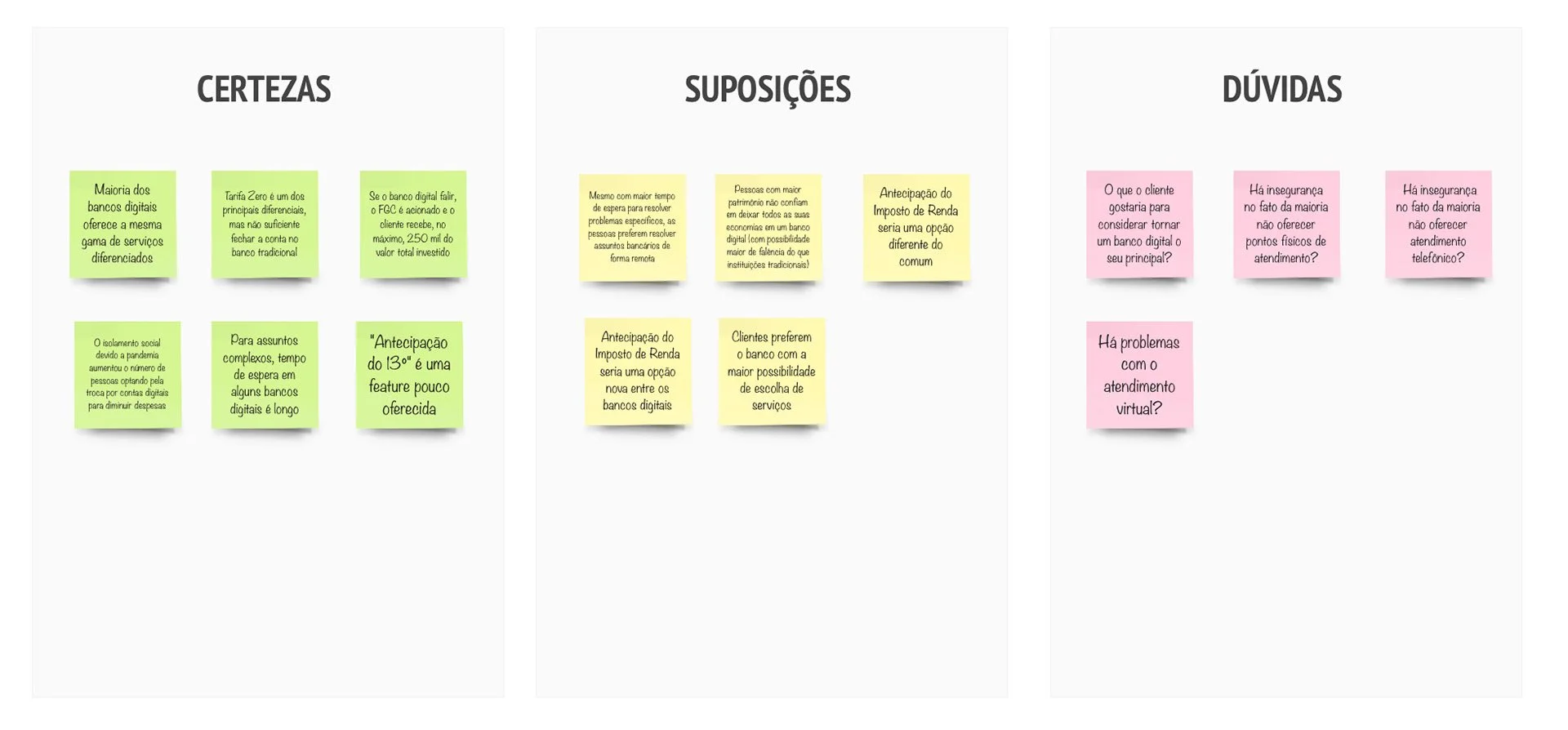 Baseado na desk research e no benchmarking, uma Matriz CSD foi criada para levantar certezas, suposições e dúvidas para obter um melhor direcionamento para a pesquisa.