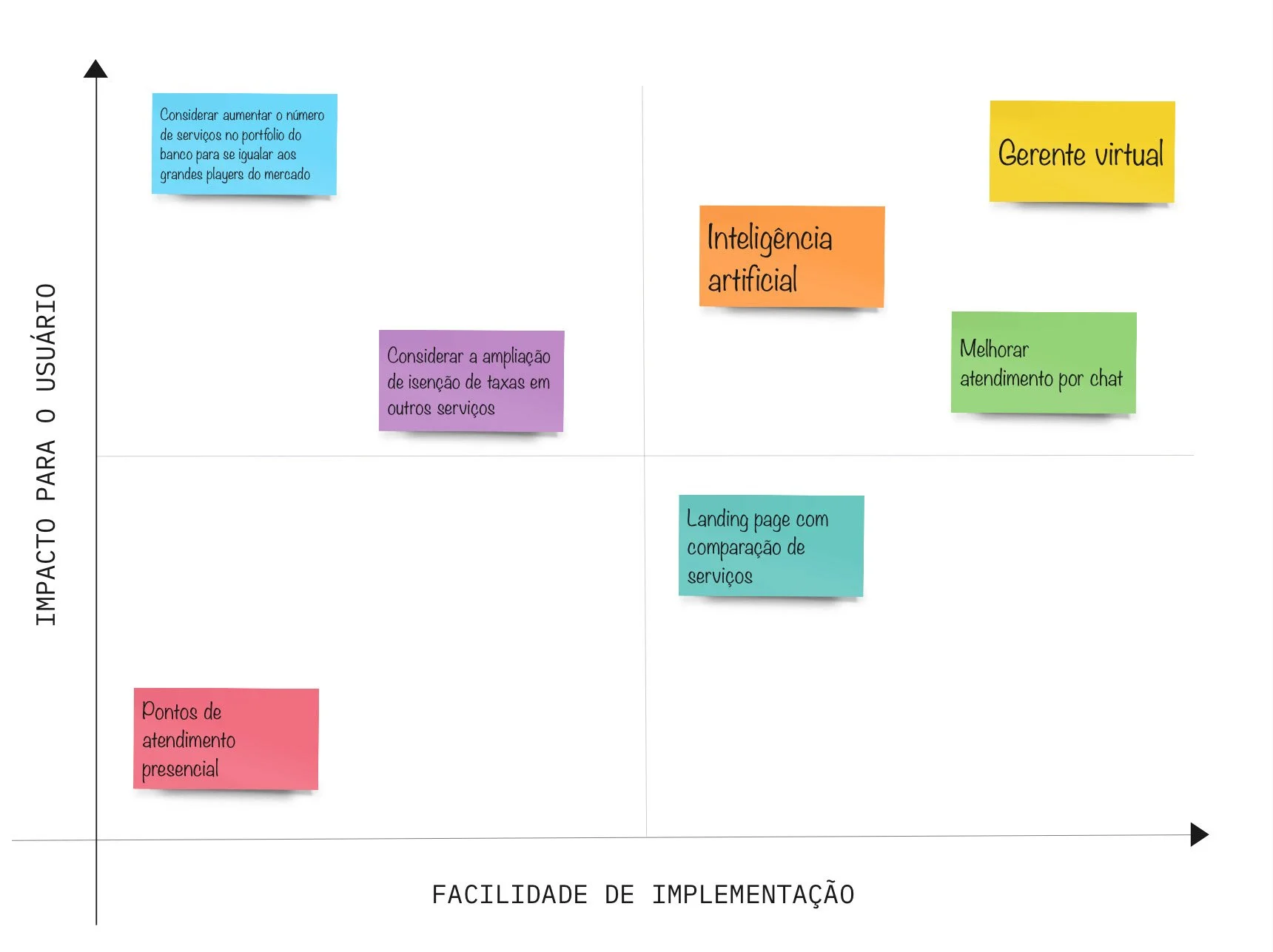 Nos quadrantes identificamos duas a três grandes possibilidades de melhoria para o usuário final, mas com diferentes níveis de complexidade técnica e de negócio.